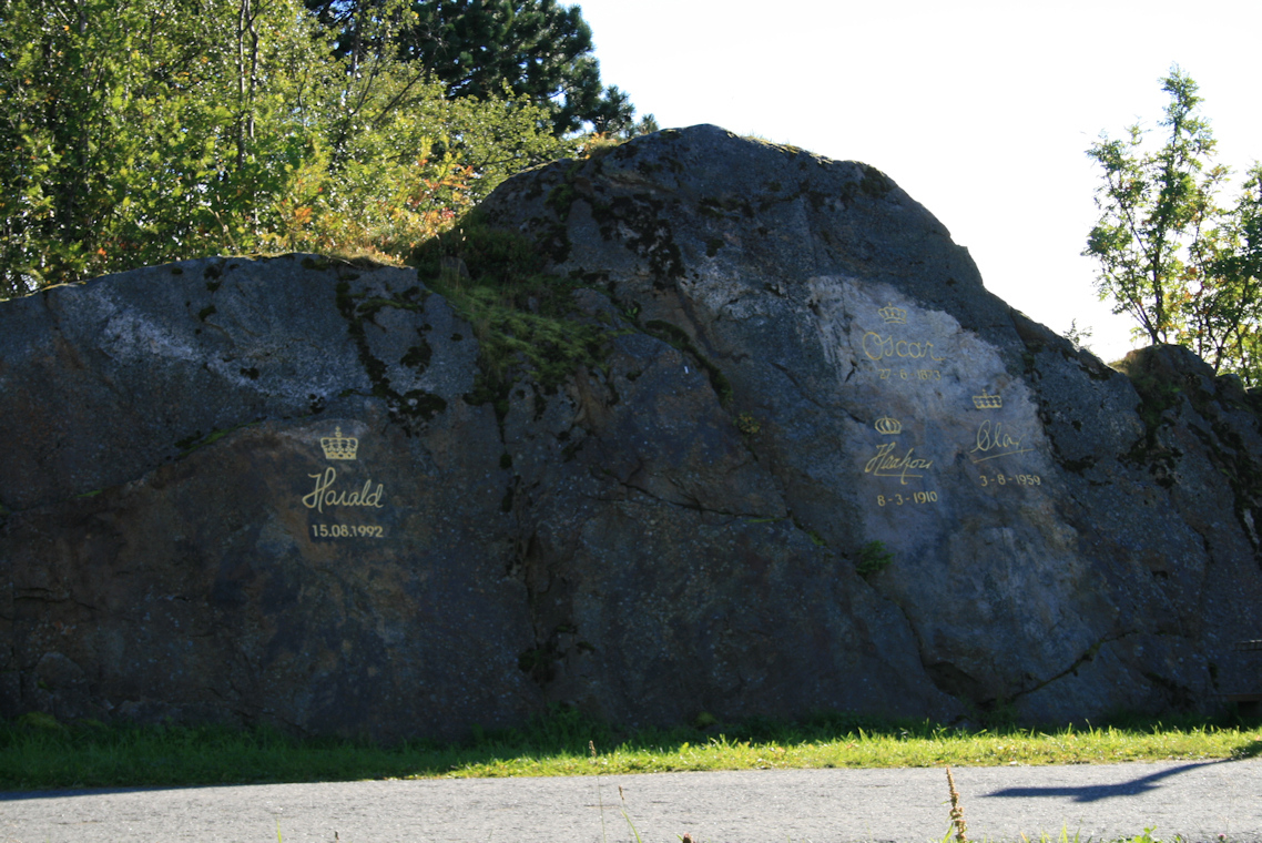 Kongenavnene inngravert i Kongesteinen i Oscarskaret i Kabelvåg