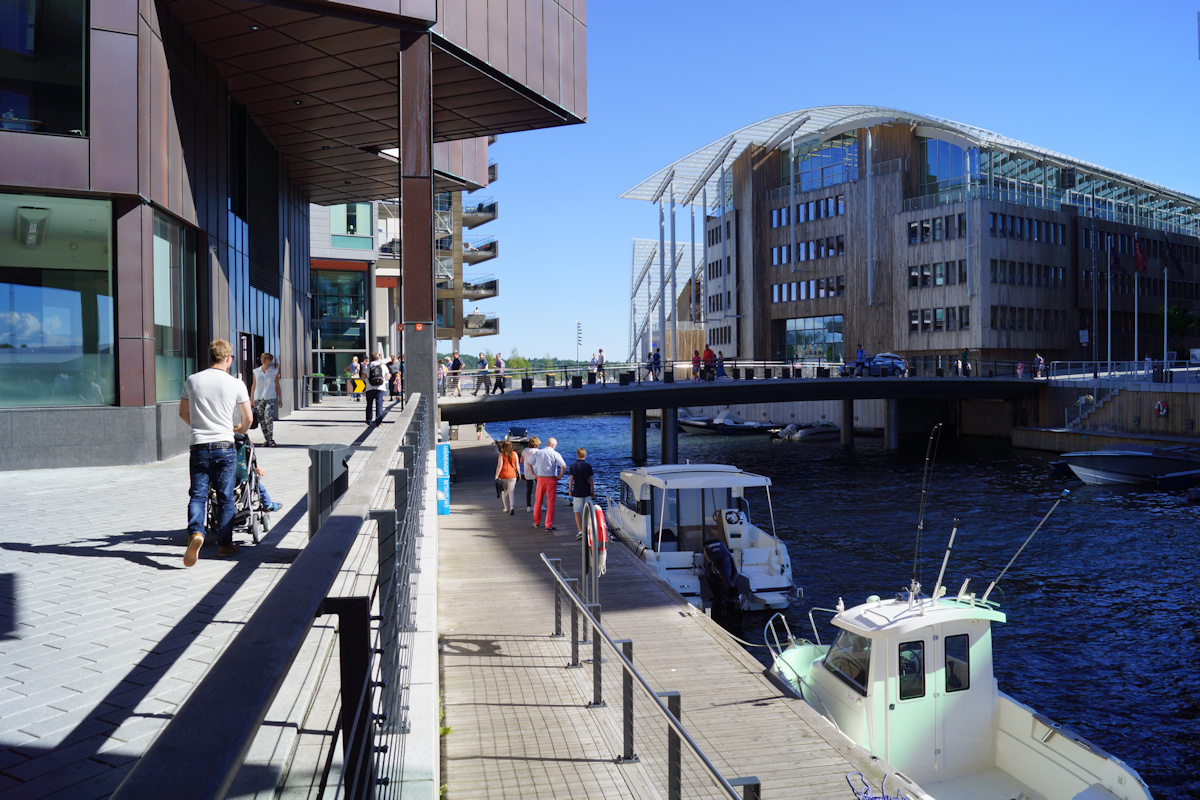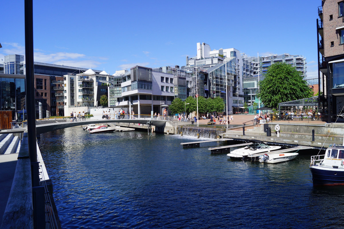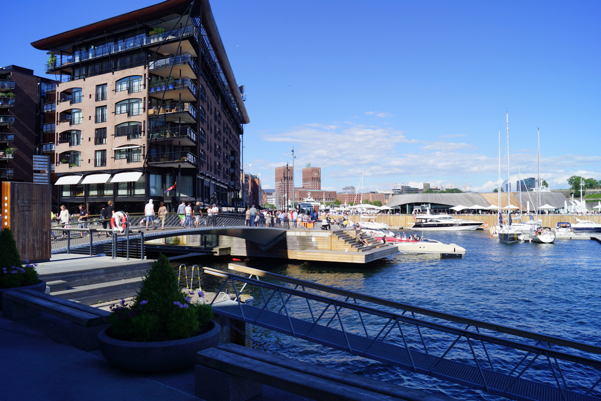 Aker Brygge er blitt et populært utfartsted både for tilreisende og byens egne innbyggere. Det er virkerlig flott her langs den lange kaipromenaden ved Oslofjorden, med god utsikt mot Akershus festning rett over fjordbotn, utsikt mot bysentret og rådhuset til venstre, og utsikt utover oslofjorden til høyre. For få år siden i 2014 ble Aker Brygge området, - utvidet med det nye Tjuvholmen området som ligger syd for Aker brygge, - og hvor begge kaipromenadene forbindes med en gangbro.